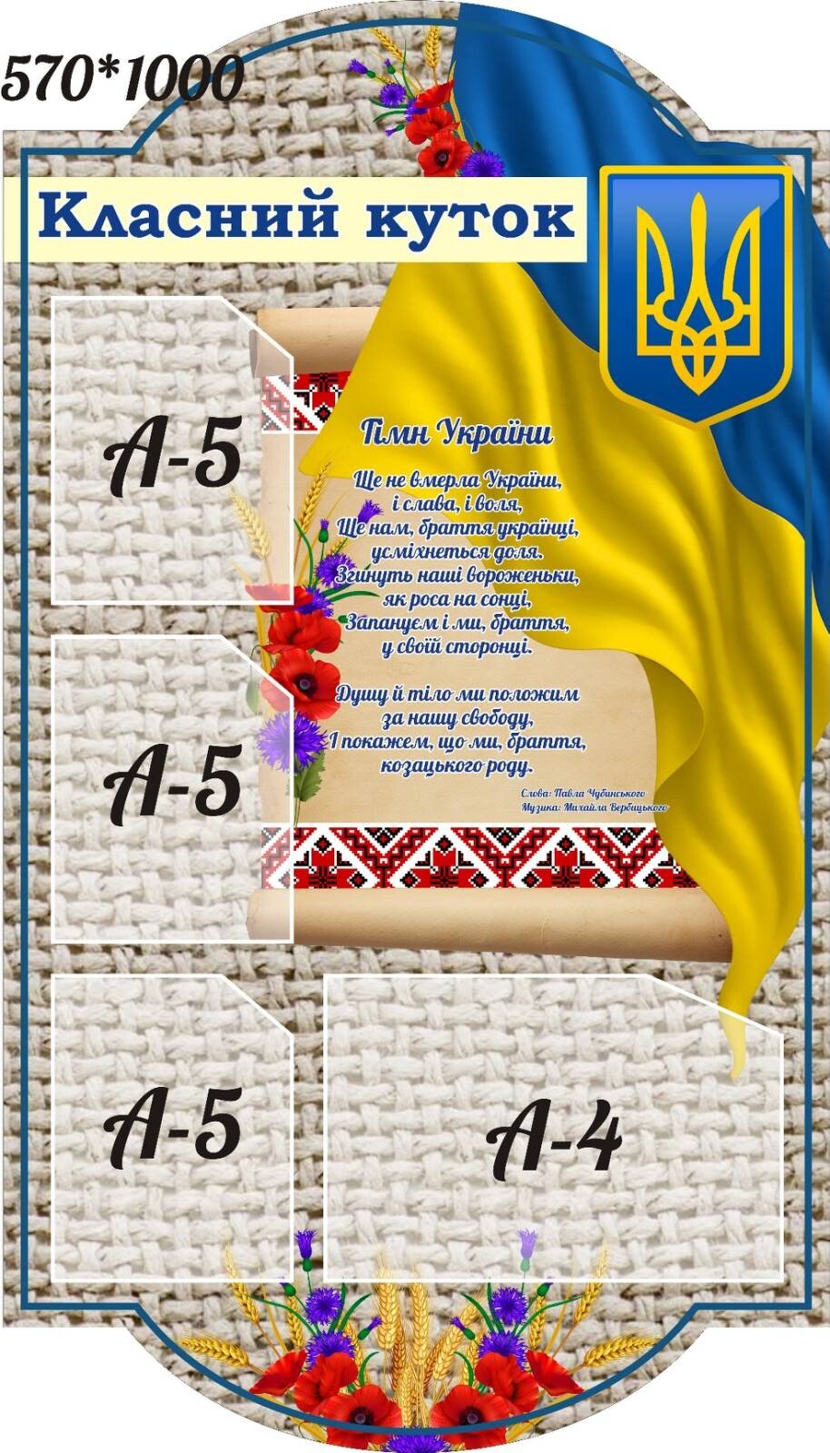 Стенд "Класний куток" призначений для оформлення учбового простору в школі та покликаний підкреслити національну ідентичність. На ньому зображено державний прапор України та герб, а також надруковано текст Державного Гімну України. Декорований українським орнаментом і квітами, стенд містить три тримачі для аркушів формату А-5 і один для А-4, що дозволяє додавати актуальну інформацію, оголошення чи навчальні матеріали. Виконаний у патріотичній стилістиці, стенд сприяє формуванню національної свідомості та гордості в учнів.