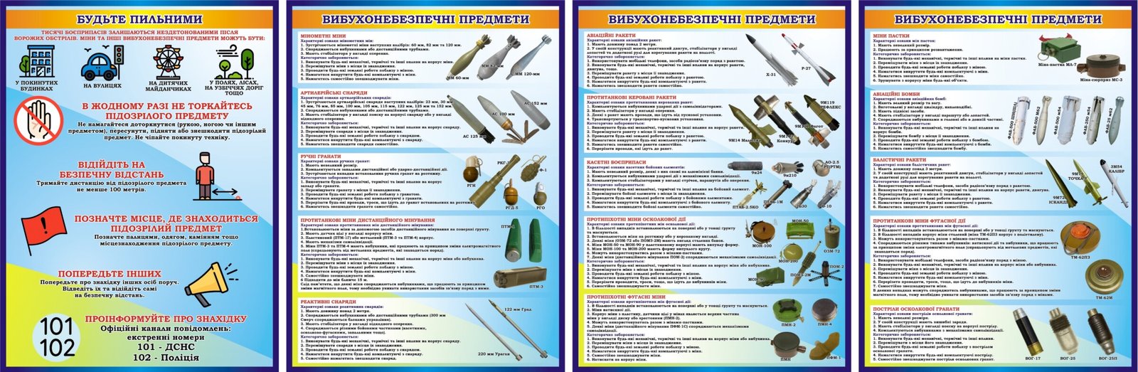 Назад Перейти в В порівняння Комплект пластикових стендів «Будьте пильними. Вибухонебезпечні предмети» (Артикул: 3-0906) Характеристики Розмір стенда: 750мм.х1000мм.х4шт. Матеріал стенда: пластик ПВХ товщиною 3 мм. Короткий опис стенда(ів) Стенд інформує про небезпечні вибухові предмети та дії у випадку їх виявлення. Він наголошує на важливості бути пильними, оскільки після обстрілів можуть залишатися вибухонебезпечні предмети в містах, на вулицях, дитячих майданчиках, полях та інших місцях. Основні поради: Не торкайтеся підозрілого предмета – не намагайтеся перемістити чи знешкодити його. Відійдіть на безпечну відстань – не менше 100 метрів. Позначте місце знаходження – використовуйте яскраві матеріали. Попередьте інших – щоб уникнути небезпеки. Повідомте компетентні органи – за телефонами 101 (ДСНС) або 102 (поліція). На додаткових стендах показані різні види вибухонебезпечних предметів, таких як міни, гранати, снаряди, ракети та міни-пастки. Вартість: 3960 грн. ХОЧУ КУПИТИ Замовити допомогу дизайнера Кожен елемент комплекту можна придбати окремо. Додаткова інформація Термін виготовлення: 3-5 робочих днів. Можливість ламінування: Немає. Способи доставки: Транспортна компанія "Нова пошта" Способи оплати: Оплата на рахунок (передоплата 100%);По перерахунку. Кріплення: Не додається. Також вас можуть зацікавити Стенд “Вибухонебезпечні предмети” (Артикул: 3-0331) Вартість: 1320 ₴ Наліпка «Вибухонебезпечні предмети» (Артикул: 3-0331) Вартість: 508 ₴ Інформаційні стенди «Вибухонебезпечні предмети» в асортименті (Артикул: 3-0490) Вартість: 990 ₴ Стенд “Будьте здорові” (Артикул: УМВ 0057) Вартість: 670 ₴ Хіти продажу Набір стендів для оформлення класу безпеки (Артикул: 3-1997) Вартість: 6311 ₴ Стенд для оформлення класу безпеки в асортименті (Артикул: 3-2135) Вартість: 1030 ₴ Куточок безпеки життєдіяльності (Артикул: 4-BG-0053) Вартість: 360 ₴ Набір стендів для оформлення класу безпеки (Артикул: 3-1950) Вартість: 8237 ₴ Категорії стендів: ≡ Стенди з безпеки життєдіяльності