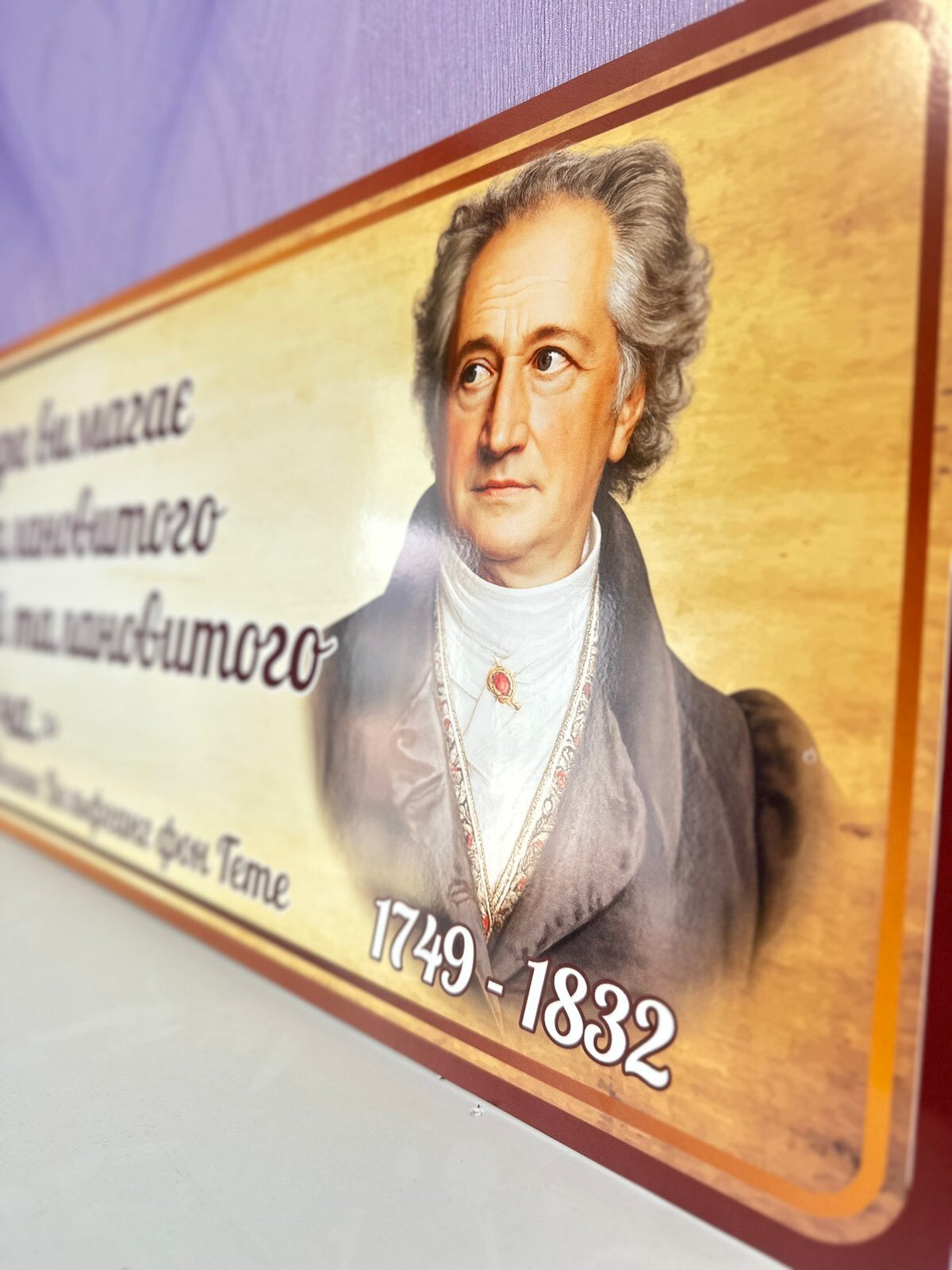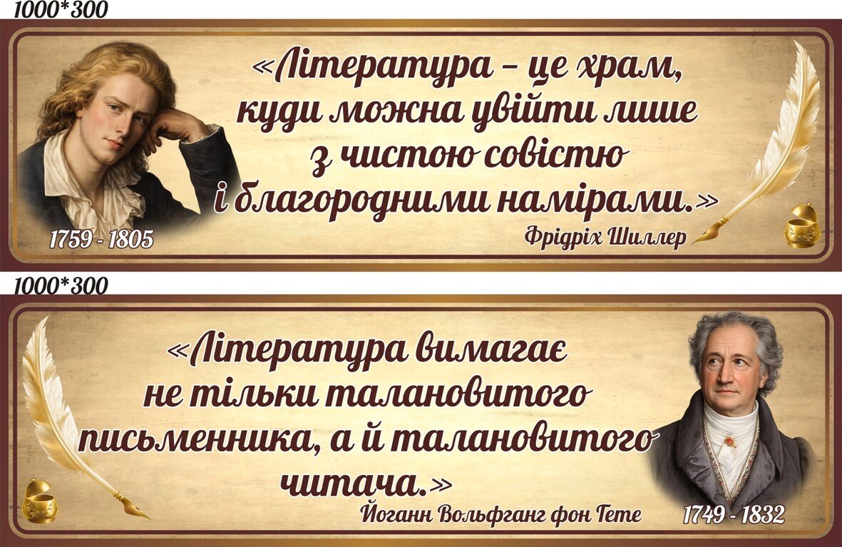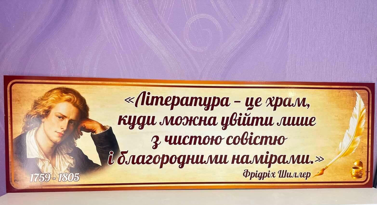 Назад Перейти в В порівняння Комплект пластикових стендів «Класика літератури в цитатах» (Артикул: 3-1095) Характеристики Розмір стенда: 1000мм.×300мм.×2шт. Матеріал стенда: пластик ПВХ товщиною 3 мм. Короткий опис стенда(ів) Стенди присвячені видатним письменникам та їхнім цитатам про літературу. Верхній стенд містить цитату Фрідріха Шиллера: «Література – це храм, куди можна увійти лише з чистою совістю і благородними намірами», підкреслюючи духовну та етичну значущість літератури. Нижній стенд цитує Йоганна Вольфганга фон Ґете: «Література вимагає не тільки талановитого письменника, а й талановитого читача», що наголошує на взаємодії між автором та читачем у літературному процесі. Обидва стенди привертають увагу до важливості літератури в культурному та особистісному розвитку. Вартість: 871 грн. ХОЧУ КУПИТИ Замовити допомогу дизайнера Кожен елемент комплекту можна придбати окремо. Додаткова інформація Термін виготовлення: 3-5 робочих днів. Можливість ламінування: Немає. Способи доставки: Транспортна компанія "Нова пошта" Способи оплати: Оплата на рахунок (передоплата 100%);По перерахунку. Кріплення: Не додається. Також вас можуть зацікавити Комплект пластикових стендів «Математика» (Артикул: 3-0648) Вартість: 4646 ₴ Комплект пластикових стендів «Внутрішня система якості освіти» (Артикул: 3-0991) Вартість: 3303 ₴ Комплект пластикових стендів «Хімія: довідкові таблиці та схеми» (Артикул: 3-1026) Вартість: 6063 ₴ Комплект пластикових стендів «Фізичні величини та одиниці» (Артикул: 3-1038) Вартість: 3596 ₴ Хіти продажу Стенд-цитата для кабінету зарубіжної літератури в асортименті (Артикул: 3-0461) Вартість: 349 ₴ Портрети зарубіжних письменників в асортименті (Артикул: 3-0243) Вартість: 157 ₴ Стенд-цитата для кабінету зарубіжної літератури (Артикул: 3-2082) Вартість: 567 ₴ Портрети в кабінет зарубіжної літератури (Артикул: 4-ZAR-0003) Вартість: 207 ₴ Категорії стендів: ≡ Стенди для кабінету зарубіжної літератури ≡ Портрети зарубіжних письменників