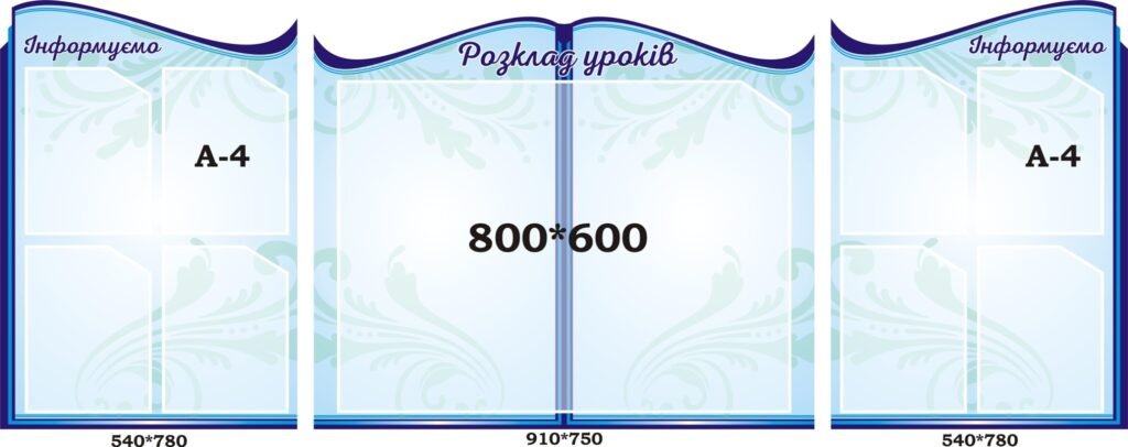 Назад Перейти в В порівняння Комплект пластикових стендів «Розклад уроків та Інформуємо» (Артикул: 3-0893) Характеристики Розмір стенда: 540мм.х780мм.х2шт., 910мм.х750мм. Матеріал стенда: пластик ПВХ товщиною 3 мм. Короткий опис стенда(ів) Стенд призначений для інформування співробітників або відвідувачів закладу. Він складається з трьох основних частин: Лівий і правий блоки: Розміром 540x780 мм кожен, вони містять кишені формату А4 для розміщення оголошень, інформаційних листів та іншої документації. Кожен блок має напис "Інформуємо". Центральний блок: Розміром 910x750 мм, цей розділ призначений для розміщення загальної інформації, може містити розклад уроків або важливі оголошення для великої кількості людей. Такий стенд ідеально підходить для шкіл, офісів та інших установ, де важливо швидко та зручно донести інформацію до аудиторії. Вартість: 2602 грн. ХОЧУ КУПИТИ Замовити допомогу дизайнера Кожен елемент комплекту можна придбати окремо. Додаткова інформація Термін виготовлення: 3-5 робочих днів. Можливість ламінування: Немає. Способи доставки: Транспортна компанія "Нова пошта" Способи оплати: Оплата на рахунок (передоплата 100%);По перерахунку. Кріплення: Не додається. Також вас можуть зацікавити Комплект стендів “Розклад уроків” (Артикул: 7-ІСД-021-2) Вартість: 2930 ₴ Комплект стендів “Розклад уроків” (Артикул: 4-RU_151) Вартість: 3850 ₴ Комплект стендів “Розклад уроків” (Артикул: 4-RU_155) Вартість: 4910 ₴ Набір стендів “Розклад уроків, гуртків і факультативів” (Артикул: 3-2049) Вартість: 2679 ₴ Хіти продажу Стенд “Академічна доброчесність” (Артикул: 4-0011) Вартість: 600 ₴ Вислови про Україну (Артикул: 4-NK_805) Вартість: 600 ₴ КОМПЛЕКТ СТЕНДІВ “ДЕРЖАВНА СИМВОЛІКА” (АРТИКУЛ: 4-DS-1041) Вартість: 360 ₴ Стенд “Символи, що роблять нас українцями. Герб, гімн, прапор” СМ 0116 Вартість: 380 ₴ Категорії стендів: ≡ Стенди для методичного кабінету школи ≡ Стенди для школи ≡ Охорона праці | методичні | атестаційні та профспілкові куточки ≡ Стенди для оформлення фойє школи ≡ Стенди для оформлення школи ≡ Стенди для шкільних коридорів ≡ Стенди для школи «Розклад уроків» ≡ Стенди для школи в учительську