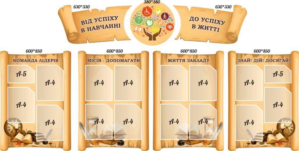 Назад Перейти в В порівняння Комплект пластикових стендів «Від успіху в навчанні – до успіху в житті» (Артикул: 3-0959) Характеристики Розмір стенда: 630мм.×330мм.×2шт., 380мм.×380мм., 600мм.×850мм.×4шт. Матеріал стенда: пластик ПВХ товщиною 3 мм. Короткий опис стенда(ів) Стенди «Від успіху в навчанні до успіху в житті» призначені для освітніх закладів і спрямовані на мотивацію та розвиток учнів. Команда лідерів: акцентує увагу на розвитку лідерських якостей та взаємодії в колективі. Місія – допомагати: заохочує учнів до волонтерства і підтримки один одного. Життя закладу: інформує про події та досягнення школи. Знай! Дій! Досягай! мотивує до особистісного зростання і досягнення поставлених цілей. Ці стенди сприяють активній участі учнів у навчальному процесі й житті школи. Вартість: 3773 грн. ХОЧУ КУПИТИ Замовити допомогу дизайнера Кожен елемент комплекту можна придбати окремо. Додаткова інформація Термін виготовлення: 3-5 робочих днів. Можливість ламінування: Немає. Способи доставки: Транспортна компанія "Нова пошта" Способи оплати: Оплата на рахунок (передоплата 100%);По перерахунку. Кріплення: Не додається. Також вас можуть зацікавити Стенд “Від успіху у навчанні до успіху в житті!” (Артикул: 3-1729) Вартість: 1135 ₴ Комплект стендів “Школа успіху” (Артикул: 7-ІСД-013-1) Вартість: 5850 ₴ Набір стендів для НУШ “Школа успіху” (Артикул: 3-2067) Вартість: 3419 ₴ Набір стендів «Від минулого до сучасності: подорож крізь епохи» (Артикул: 3-0559) Вартість: 6336 ₴ Хіти продажу Стенд “Академічна доброчесність” (Артикул: 4-0011) Вартість: 600 ₴ Вислови про Україну (Артикул: 4-NK_805) Вартість: 600 ₴ КОМПЛЕКТ СТЕНДІВ “ДЕРЖАВНА СИМВОЛІКА” (АРТИКУЛ: 4-DS-1041) Вартість: 360 ₴ Стенд “Символи, що роблять нас українцями. Герб, гімн, прапор” СМ 0116 Вартість: 380 ₴ Категорії стендів: ≡ Стенди для методичного кабінету школи ≡ Стенди для школи ≡ Охорона праці | методичні | атестаційні та профспілкові куточки ≡ Стенди для оформлення фойє школи ≡ Стенди для оформлення школи ≡ Стенди для шкільних коридорів ≡ Стенди для школи в учительську