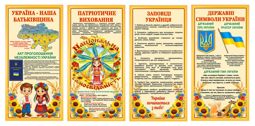 Назад Перейти в В порівняння Комплект стендів “Державна символіка України” (АРТИКУЛ: 4-DS-1214) Характеристики Розмір стенда: 50х100см Матеріал стенда: пластик ПВХ товщиною 3 мм. Короткий опис стенда(ів) Стенди присвячені національно-патріотичному вихованню в Україні. Їх зміст охоплює кілька ключових аспектів: Україна - наша Батьківщина: інформація про Акт проголошення незалежності України, географічна карта з областями та символами, а також витяги з Конституції України. Патріотичне виховання: опис того, що таке національна самосвідомість, її значення та як виявляти патріотизм щодня. Заповіді України: правила та принципи національного виховання, які підкреслюють важливість любові до Батьківщини, родини та народу. Державні символи України: деталі про герб, прапор та гімн України, їх значення та історія. Вартість: 2400 грн. ХОЧУ КУПИТИ Замовити допомогу дизайнера Кожен елемент комплекту можна придбати окремо. Додаткова інформація Термін виготовлення: 3-7 робочих днів. Можливість ламінування: Так. +100 грн/м2. Способи доставки: Транспортна компанія "Нова пошта" Способи оплати: Оплата при отриманні;Оплата на карту (передоплата);По перерахунку. Кріплення: В комплекті. Саморізи звичайні. Також вас можуть зацікавити Комплект стендів “Державна символіка України” (Артикул: 4-DS_1037) Вартість: 1024 ₴ Комплект стендів “Державна символіка України” (Артикул: 4-DS_1203) Вартість: 3450 ₴ Оформлення класу «Державна символіка України» (Артикул: 3-0765) Вартість: 523 ₴ Інформаційний стенд «Державна символіка України»(Артикул: 3-0853) Вартість: 980 ₴ Хіти продажу Стенд “Академічна доброчесність” (Артикул: 4-0011) Вартість: 690 ₴ Вислови про Україну (Артикул: 4-NK_805) Вартість: 690 ₴ Стенд “Символи, що роблять нас українцями. Герб, гімн, прапор” СМ 0116 Вартість: 380 ₴ КОМПЛЕКТ СТЕНДІВ “ДЕРЖАВНА СИМВОЛІКА” (АРТИКУЛ: 4-DS-1041) Вартість: 414 ₴ Категорії стендів: ≡ NEW ≡ Державна символіка ≡ Стенди для оформлення фойє школи ≡ Стенди для оформлення школи ≡ Стенди для шкільних коридорів