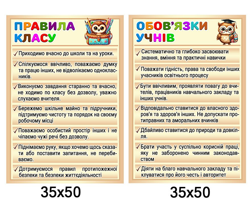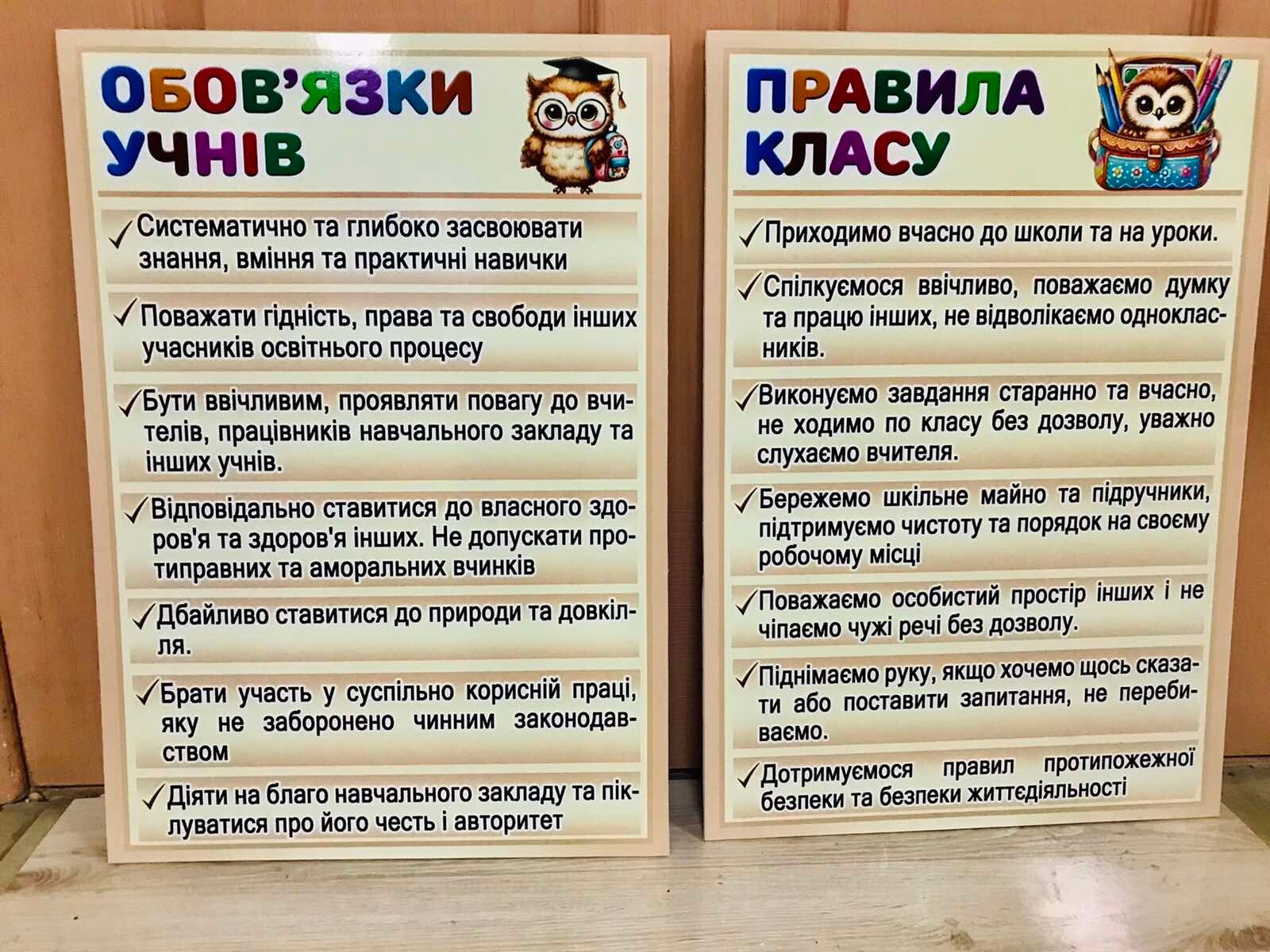 Назад Перейти в В порівняння Комплект стендів “Права та обов’язки”” із серії “Сови” (Артикул: 4-NK_20002) Характеристики Розмір стенда: 35х50см Матеріал стенда: пластик ПВХ товщиною 3 мм. Короткий опис стенда(ів) Стенди містять правила класу та обов'язки учнів. Лівий стенд ознайомлює з основними нормами поведінки школярів, такими як: своєчасність приходу на уроки, ввічливе спілкування, дотримування шкільного майна та власного простору, слухняність учителя та дотримання правил безпеки. Правий стенд описує обов'язки учнів. Це включає систематичне засвоєння знань, повагу до прав інших, ввічливість, відповідальність за власне здоров'я та навколишнє середовище. Також учні мають брати участь у суспільно корисній праці та підтримувати навчальний заклад. Вартість: 420 грн. ХОЧУ КУПИТИ Замовити допомогу дизайнера Кожен елемент комплекту можна придбати окремо. Додаткова інформація Термін виготовлення: 3-7 робочих днів. Можливість ламінування: Так. +100 грн/м2. Способи доставки: Транспортна компанія "Нова пошта" Способи оплати: Оплата при отриманні;Оплата на карту (передоплата);По перерахунку. Кріплення: В комплекті. Саморізи звичайні. Також вас можуть зацікавити Комплект стендів “Щоденні 3,5” із серії “Сови” (Артикул: 4-NK_20002) Вартість: 360 ₴ Комплект стендів із серії “Сови” (Артикул: 4-NK_20004) Вартість: 960 ₴ Комплект стендів Пиши правильно із серії “Сови” (Артикул: 4-NK_20001) Вартість: 1800 ₴ Комплект стендів із серії “Сови” (Артикул: 4-NK_20005) Вартість: 3360 ₴ Хіти продажу Комплект стендів ” Мовна та математична скриньки” (Артикул: 4-NK-650) Вартість: 1440 ₴ Вислови про Україну (Артикул: 4-NK_805) Вартість: 690 ₴ Стенди ” Скарбнички” (Артикул: 4-NK-643) Вартість: 1380 ₴ Набір стендів “Мовна та математична скарбнички” (АРТИКУЛ: 4-NK-896) Вартість: 1380 ₴ Категорії стендів: ≡ Стенди для початкових класів ≡ Комплекти стендів для початкової школи ≡ Стенди для початкової школи - Різні