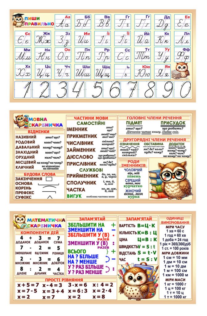 Назад Перейти в В порівняння Комплект стендів Пиши правильно із серії “Сови” (Артикул: 4-NK_20001) Характеристики Розмір стенда: 50х100см Матеріал стенда: пластик ПВХ товщиною 3 мм. Короткий опис стенда(ів) Стенди призначені для навчання молодших школярів правильному написанню українського алфавіту, вивченню частин мови та математичних основ. Пиши правильно: представлено український алфавіт з прикладами каліграфічного написання букв і цифр від 0 до 9. Мовна скарбничка: йдеться про відмінки, частини мови, головні та другорядні члени речення, а також рід іменників. Математична скарбничка: містить інформацію про компоненти дій, запам’ятовування правил збільшення і зменшення, прості рівняння та одиниці вимірювання. Ці стенди допомагають учням структурувати знання та сприяють кращому запам'ятовуванню матеріалу. Вартість: 1800 грн. ХОЧУ КУПИТИ Замовити допомогу дизайнера Кожен елемент комплекту можна придбати окремо. Додаткова інформація Термін виготовлення: 3-7 робочих днів. Можливість ламінування: Так. +100 грн/м2. Способи доставки: Транспортна компанія "Нова пошта" Способи оплати: Оплата при отриманні;Оплата на карту (передоплата);По перерахунку. Кріплення: В комплекті. Саморізи звичайні. Також вас можуть зацікавити Комплект стендів із серії “Сови” (Артикул: 4-NK_20004) Вартість: 960 ₴ Стенд “Сиди правильно і пиши правильно” НУШ 0237 Вартість: 475 ₴ Комплект стендів “Пиши правильно” (Артикул: 4-NK-538) Вартість: 860 ₴ Комплект стендів ” Пиши правильно” (Артикул: 4-NK-410) Вартість: 860 ₴ Хіти продажу Комплект стендів ” Мовна та математична скриньки” (Артикул: 4-NK-650) Вартість: 1440 ₴ Вислови про Україну (Артикул: 4-NK_805) Вартість: 690 ₴ Комплект стендів “Пиши правильно” (Артикул: 4-NK-538) Вартість: 860 ₴ Стенди ” Скарбнички” (Артикул: 4-NK-643) Вартість: 1380 ₴ Категорії стендів: ≡ NEW ≡ Стенди для початкових класів ≡ Алфавіт | абетка | види з’єднань ≡ Комплекти стендів для НУШ ≡ Комплекти стендів для початкової школи ≡ Математичні куточки для початкової школи ≡ Мовні куточки для початкової школи ≡ Стенди для початкової школи - Різні