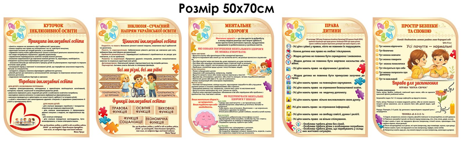 Стенди присвячені темі інклюзивної освіти, ментального здоров'я та прав дітей.