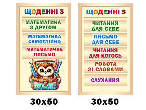 Назад Перейти в В порівняння Комплект стендів “Щоденні 3,5” із серії “Сови” (Артикул: 4-NK_20002) Характеристики Розмір стенда: 30х50см Матеріал стенда: пластик ПВХ товщиною 3 мм. Короткий опис стенда(ів) Стенди ілюструють навчальні завдання для молодших школярів. Вони розділені на дві частини: щоденні завдання для третього та п'ятого класів. Щоденні 3: Математика з другом Математика самостійно Математичне письмо Щоденні 5: Читання для себе Письмо для себе Читання для когось Робота зі словами Слухання Кожен стенд допомагає учням планувати навчання, розвиваючи навички в цих важливих сферах. Вартість: 360 грн. ХОЧУ КУПИТИ Замовити допомогу дизайнера Кожен елемент комплекту можна придбати окремо. Додаткова інформація Термін виготовлення: 3-7 робочих днів. Можливість ламінування: Так. +100 грн/м2. Способи доставки: Транспортна компанія "Нова пошта" Способи оплати: Оплата при отриманні;Оплата на карту (передоплата);По перерахунку. Кріплення: В комплекті. Саморізи звичайні. Також вас можуть зацікавити Комплект стендів із серії “Сови” (Артикул: 4-NK_20004) Вартість: 960 ₴ Комплект стендів Пиши правильно із серії “Сови” (Артикул: 4-NK_20001) Вартість: 1800 ₴ Стенд “Щоденні 3 – Щоденні 5” (Артикул: 3-1929) Вартість: 508 ₴ Наліпка для НУШ «Щоденні 3 – Щоденні 5» (Артикул: 3-1929) Вартість: 163 ₴ Хіти продажу Комплект стендів ” Мовна та математична скриньки” (Артикул: 4-NK-650) Вартість: 1440 ₴ Вислови про Україну (Артикул: 4-NK_805) Вартість: 690 ₴ Стенди ” Скарбнички” (Артикул: 4-NK-643) Вартість: 1380 ₴ Набір стендів “Мовна та математична скарбнички” (АРТИКУЛ: 4-NK-896) Вартість: 1380 ₴ Категорії стендів: ≡ NEW ≡ Стенди для НУШ ≡ Стенди для початкових класів ≡ Комплекти стендів для НУШ ≡ Комплекти стендів для початкової школи ≡ Стенди для початкової школи - Різні