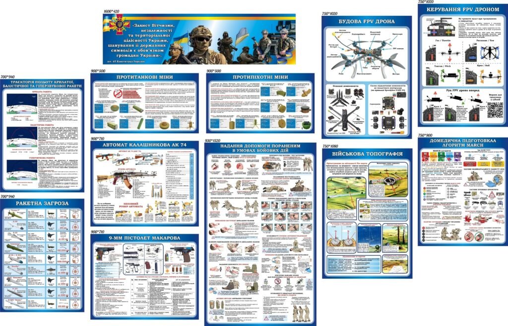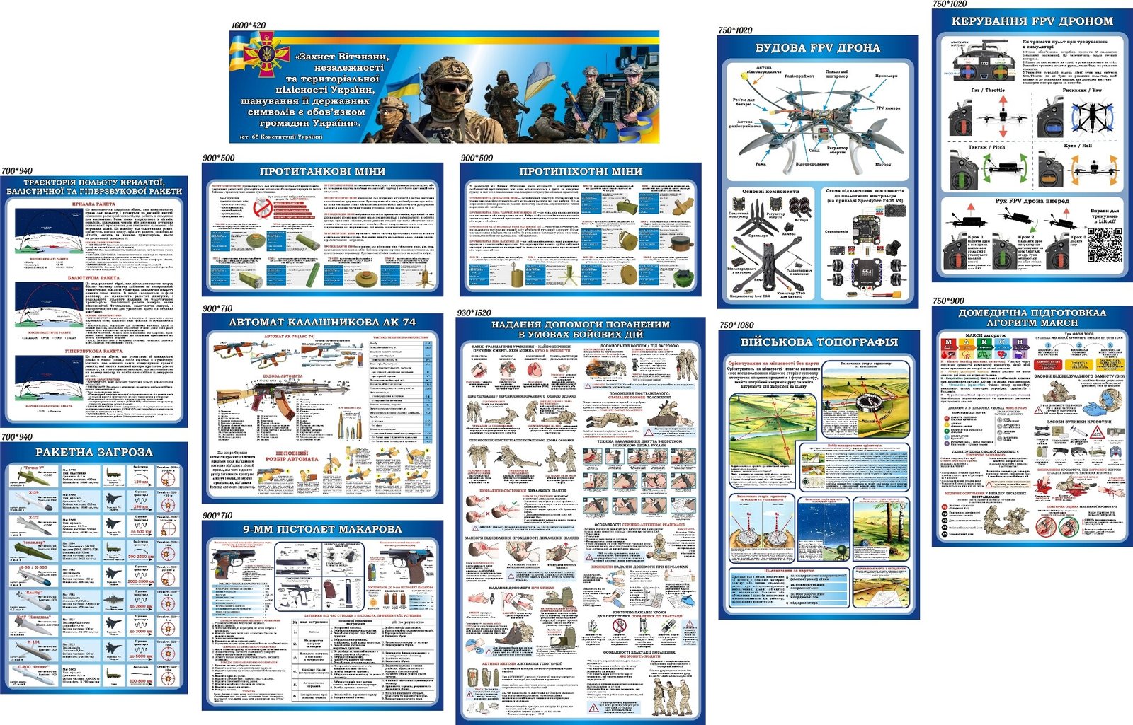 Назад Перейти в В порівняння Комплект стендів «Військова підготовка та основи безпеки» (Артикул: 3-1109) Характеристики Розмір стенда: 1600мм.х420мм., 700мм.х940мм.х2шт., 900мм.х500мм.х2шт., 900мм.х710мм.х2шт., 750мм.х1020мм.х2шт., 930мм.х1520мм., 750мм.х1080мм., 750мм.х900мм. Матеріал стенда: пластик ПВХ товщиною 3 мм. Короткий опис стенда(ів) Комплект стендів присвячений різним аспектам військової підготовки та загроз. Тема включає опис траєкторій польоту ракет, як крилатих, так і балістичних, та заходи захисту від них. Розглянуто протитанкові та протипіхотні міни, їхні характеристики та механізми дії. Також описано конструкцію та керування FPV дронами. Особливу увагу приділено вивченню автомату Калашникова АК-74, 9-мм пістолета Макарова, військовій топографії та наданню першої допомоги в бойових умовах. Інформація про домедичну підготовку згрупована за алгоритмом MARCH. Вартість: 12488 грн. ХОЧУ КУПИТИ Замовити допомогу дизайнера Кожен елемент комплекту можна придбати окремо. Додаткова інформація Термін виготовлення: 3-5 робочих днів. Можливість ламінування: Немає. Способи доставки: Транспортна компанія "Нова пошта" Способи оплати: Оплата на рахунок (передоплата 100%);По перерахунку. Кріплення: Не додається. Також вас можуть зацікавити Стенд «Інженерна підготовка. Військова топографія» (Артикул: 3-1495) Вартість: 1045 ₴ Комплект пластикових стендів «Основи безпеки для дітей» (Артикул: 3-0951) Вартість: 4634 ₴ Інформаційний стенд «Основи життєдіяльності та безпеки» в асортименті (Артикул: 3-2354) Вартість: 1089 ₴ Комплект: Техніка безпеки, класний куточок, підготовка до ЗНО і ПДА (Артикул: 3-0470) Вартість: 2955 ₴ Хіти продажу Стенд «Військові звання та знаки розрізнення» (Артикул: 3-2149) Вартість: 837 ₴ Стенд “Герої не вмирають” ПЗ 0032 Вартість: 645 ₴ Стенд «Військова присяга, бойовий прапор» (Артикул: 3-1526) Вартість: 349 ₴ Стенд “Перша медична допомога” (Артикул: 3-1917) Вартість: 1394 ₴ Категорії стендів: ≡ Стенди в кабінет “Захист України”