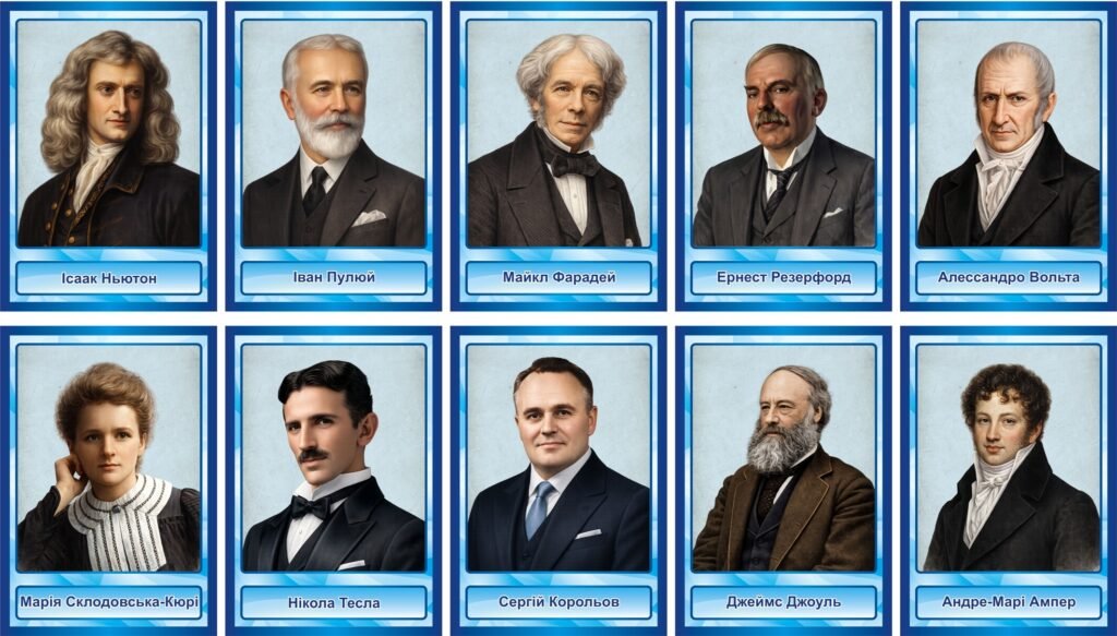 Стенд представляє видатних вчених, які зробили значний внесок у розвиток науки та технологій. Він містить портрети й імена таких відомих діячів: