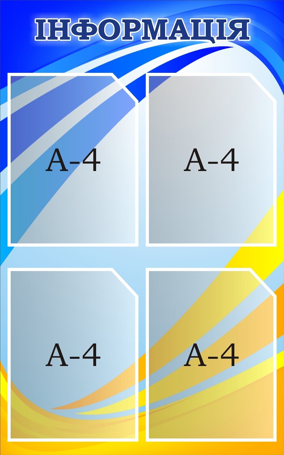 Стенд призначений для розміщення інформаційних матеріалів формату А4. Має заголовок "Інформація" і складається з чотирьох секцій, кожна з яких вміщує документ формату А4. Оформлення виконано в яскравій кольоровій гамі з блакитними та жовтими градієнтами, що надають стенду привабливий вигляд і привертають увагу. Такий стенд ідеально підходить для шкіл, офісів або громадських місць, де необхідно регулярно оновлювати інформацію, полегшуючи її сприйняття та організацію.