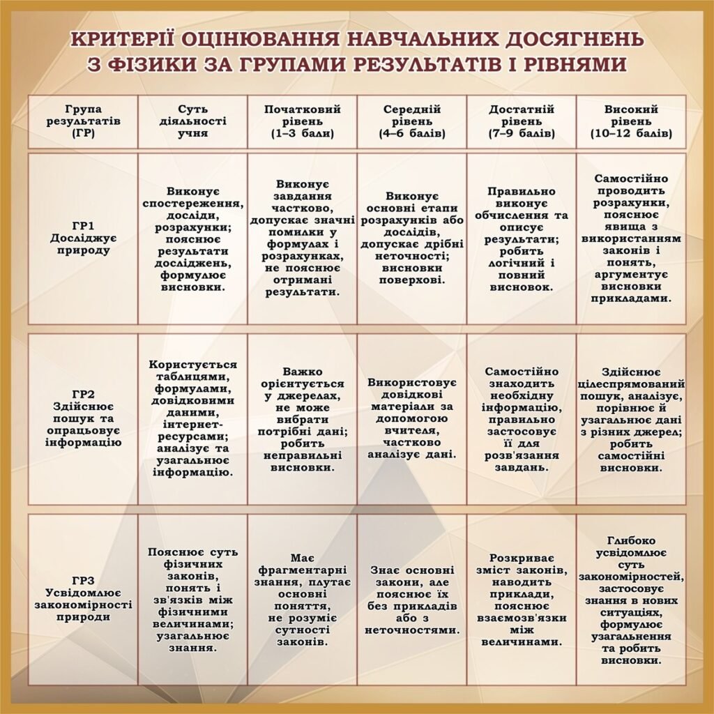 Стенд представляє критерії оцінювання навчальних досягнень з фізики, поділені на групи результатів і рівні.