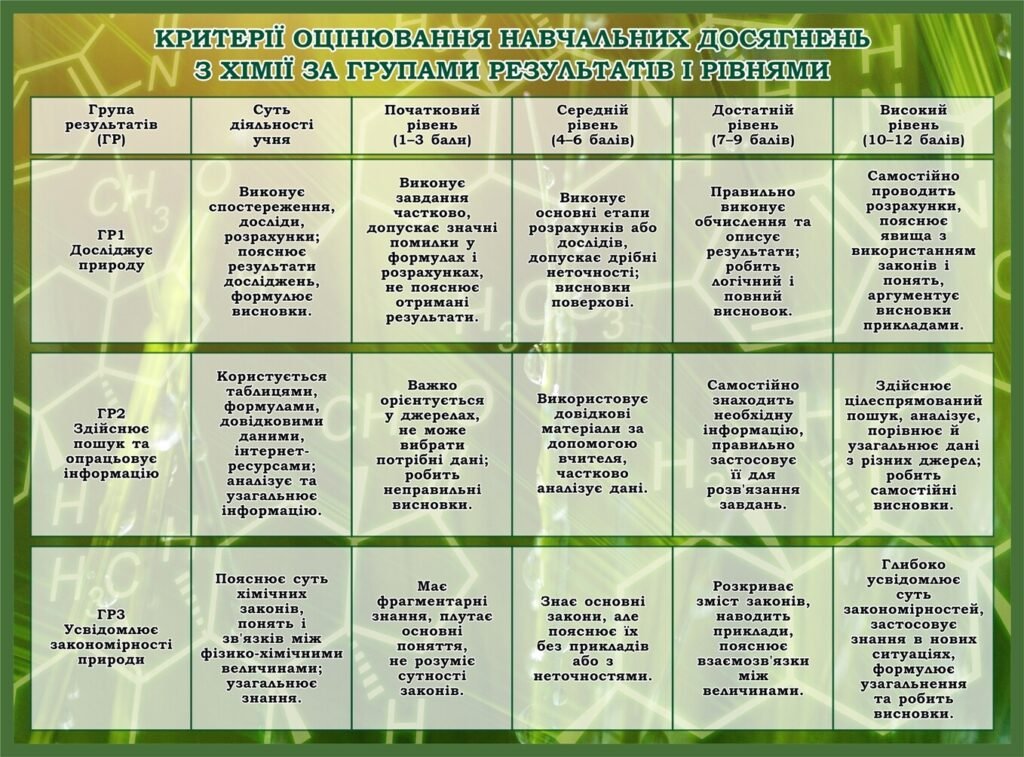 Стенд призначений для критеріального оцінювання навчальних досягнень з хімії, розподілених за групами результатів і рівнями. Він містить таблицю з трьома основними групами результатів: