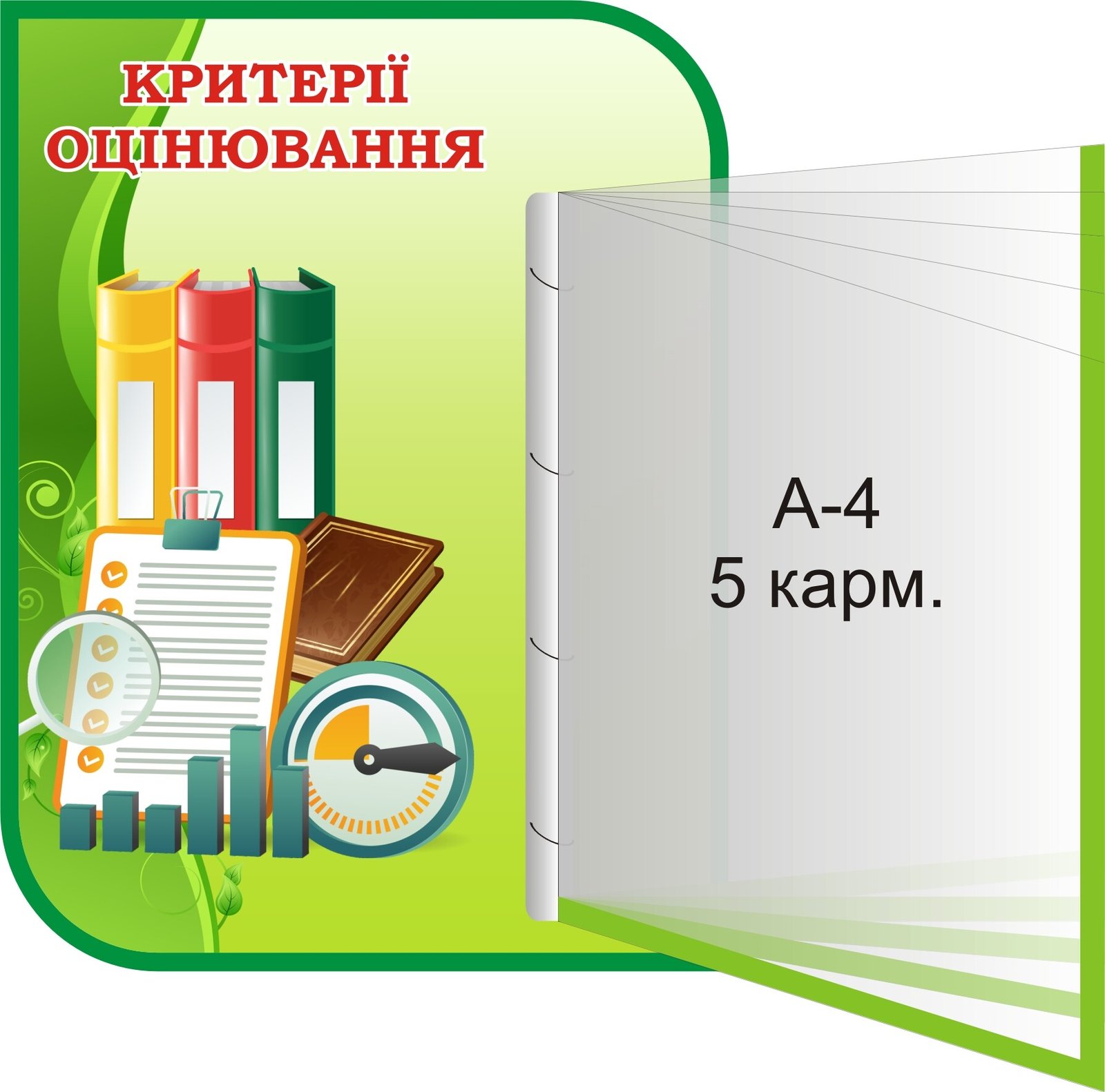 Стенд призначений для відображення критеріїв оцінювання. На ньому присутні графічні зображення, такі як барвисті книги, аркуш з відмітками, письмове приладдя та графік, що символізують процес оцінки. Праворуч на стенді є прозорі кишені формату А-4 з можливістю вмістити до п'яти аркушів. Цей стенд може використовуватися в освітніх установах для забезпечення зрозумілого та інтерактивного уявлення про критерії оцінювання для учнів і вчителів.
