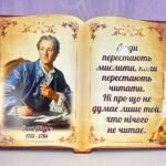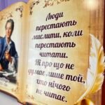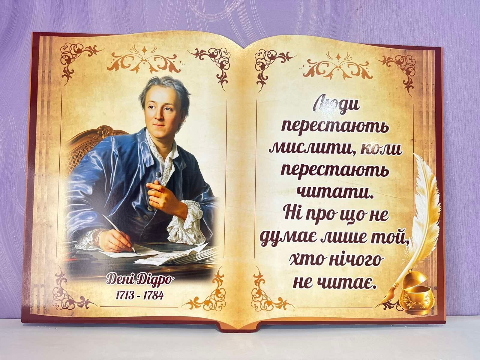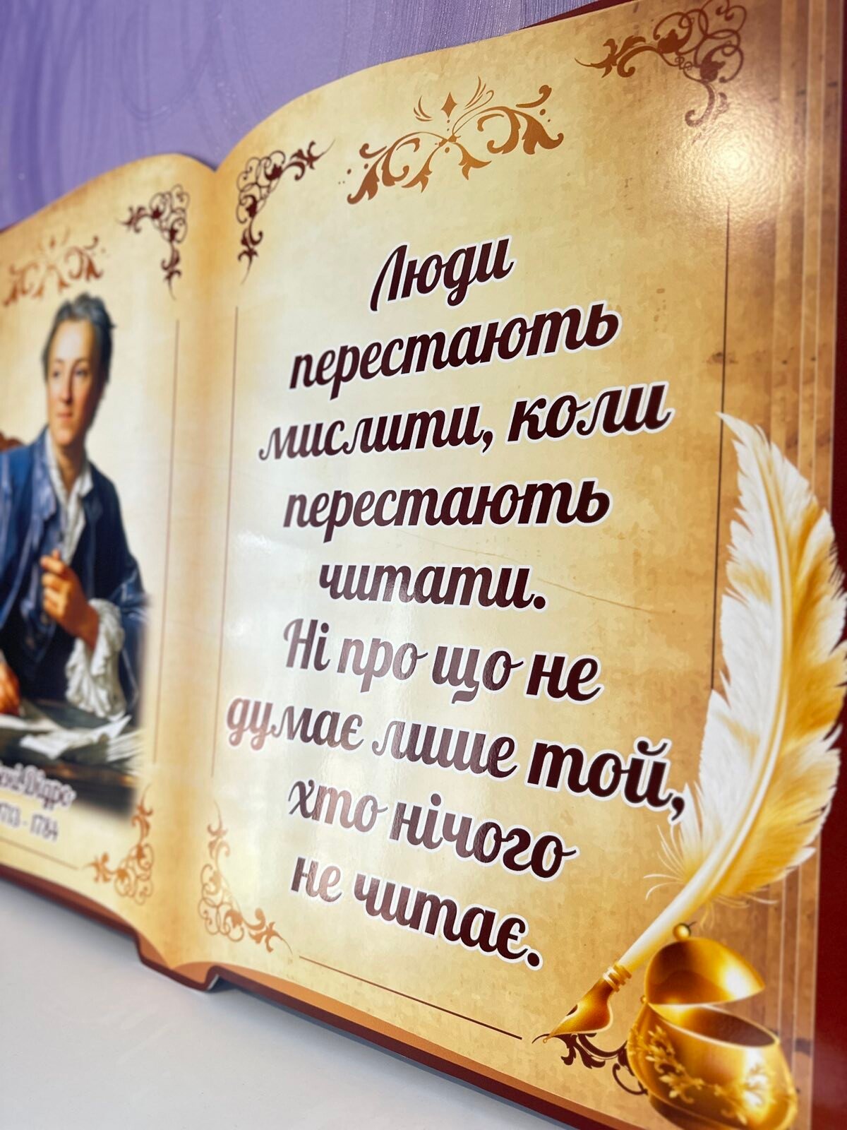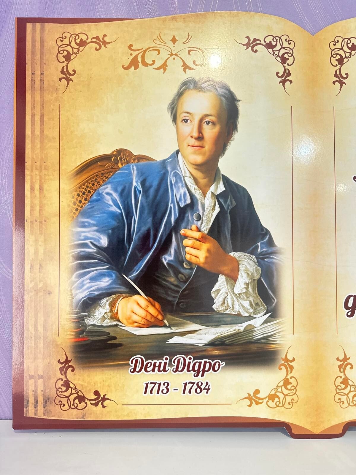 Стенд присвячений видатному французькому філософу і письменнику Дені Дідро. На стенді зображено портрет Дідро, а поруч наведена його цитата: "Люди перестають мислити, коли перестають читати. Ні про що не думає лише той, хто нічого не читає." Цей вислів підкреслює важливість читання для розвитку інтелекту і здатності мислити. Дата народження і смерті Дені Дідро (1713-1784) також вказана на стенді. Декоративні елементи навколо тексту додають естетичного вигляду і підкреслюють історичний контекст.