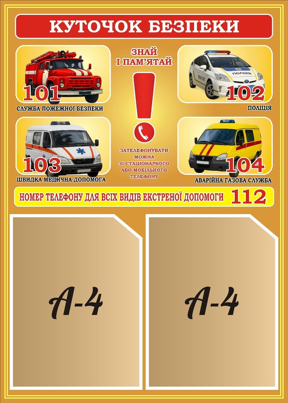 Стенд "Куточок безпеки" призначений для інформування громадян про екстрені служби та їхні контактні номери. На стенді вказані телефонні номери наступних служб:
