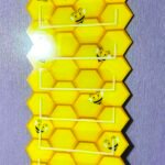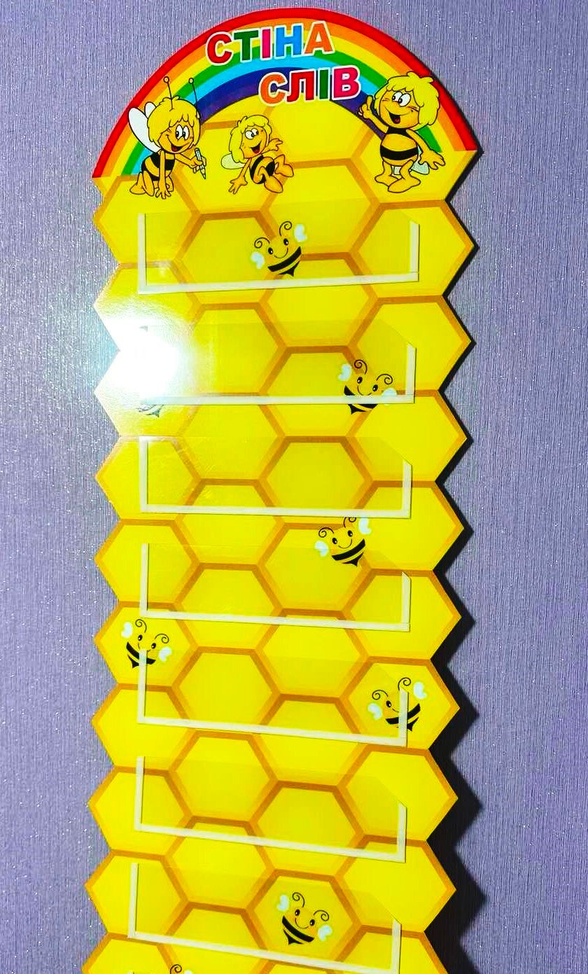 Цей стенд стилізований у формі стільників із яскравими зображеннями бджілок, що надає йому привабливості та цікавості для дітей.