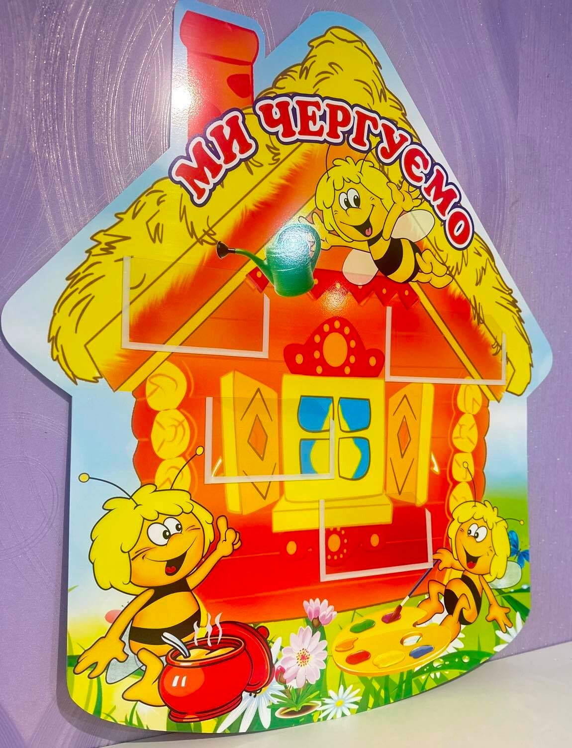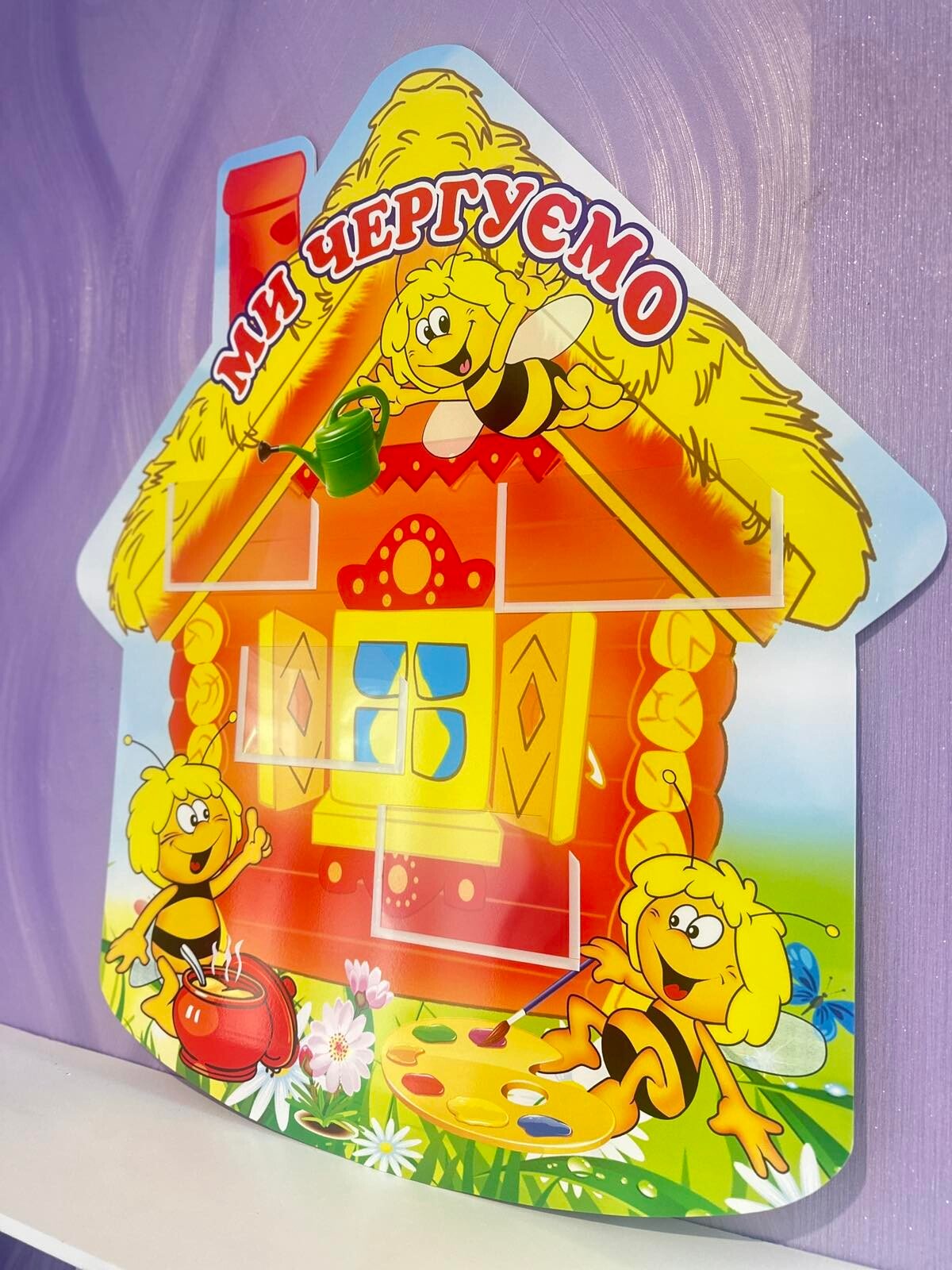 Стенд "Ми чергуємо" призначений для навчальних закладів, зокрема дитячих садочків або шкіл. Він виконує функцію організації та чергування дітей у певних завданнях. Яскравий дизайн у вигляді хатинки з бджілками заохочує дітей до активної участі. На стенді присутні розділи із розмірами 120×80 мм та 150×80 мм, де можна розміщувати картки або імена дітей, які чергують у конкретних обов'язках, таких як поливання рослин чи допомога в класі. Це сприяє розвитку відповідальності та організаторських навичок у малечі.