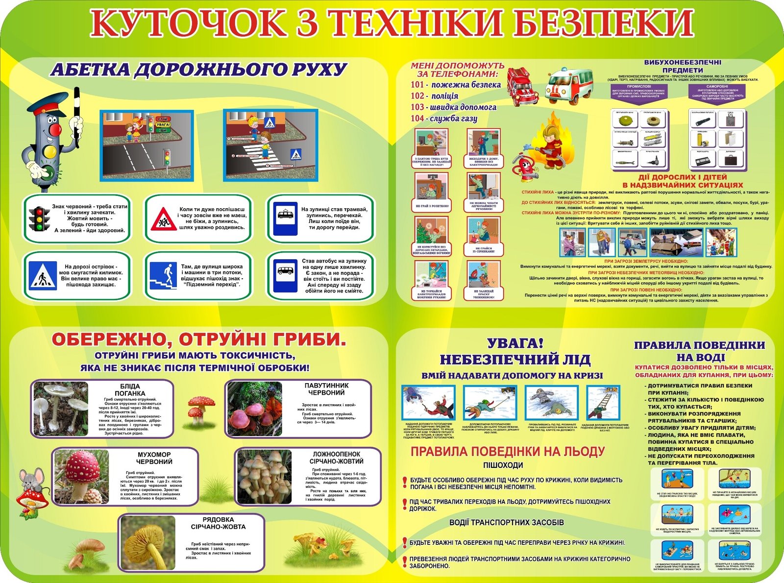 Стенд «Куточок з техніки безпеки» містить інформацію для дітей та дорослих про безпеку та небезпечні ситуації.