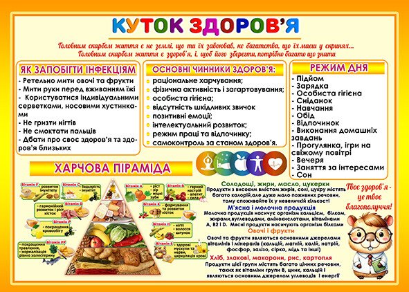 Стенд "Куток Здоров'я" містить інформацію про збереження здоров'я та запобігання інфекціям.