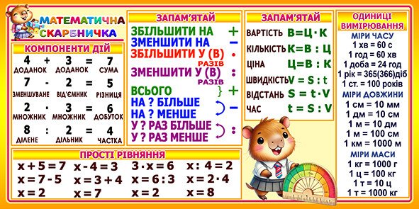Стенд "Математична скарбничка" допомагає учням заглибитись у базові математичні операції та поняття. Він містить: