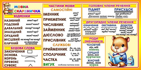 Стенд під назвою "Мовна скарбничка" містить основні елементи вивчення української мови. Він розділений на кілька секцій: