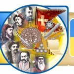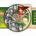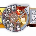 Центральна частина містить зображення історичних постатей та символи, що втілюють героїчне минуле країни.