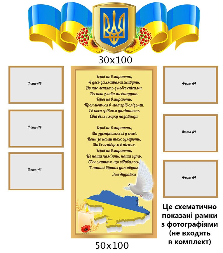 Назад Перейти в В порівняння Стенд “Патріотичне виховання (Артикул: 4-ПП_0010) Характеристики Розмір стенда: 50х100см,30х100см Матеріал стенда: пластик ПВХ товщиною 3 мм. Короткий опис стенда(ів) Стенд присвячено вшануванню пам’яті героїв. В центрі розміщено вірш Зої Журавки, присвячений героям, які не вмирають, живуть у серцях людей та нагадують про свою мужність. Над віршем розташований герб України зі стрічкою, прикрашеною калиною. Навколо вірша є рамки для фотографій, які символізують місце для пам’яті загиблих. Нижче зображена карта України із голубом — символом миру. Рамки призначені для фотографій і не входять до комплекту стенду. Вартість: 960 грн. ХОЧУ КУПИТИ Замовити допомогу дизайнера Кожен елемент комплекту можна придбати окремо. Додаткова інформація Термін виготовлення: 3-7 робочих днів. Можливість ламінування: Так. +100 грн/м2. Способи доставки: Транспортна компанія "Нова пошта" Способи оплати: Оплата при отриманні;Оплата на карту (передоплата);По перерахунку. Кріплення: В комплекті. Саморізи звичайні. Також вас можуть зацікавити Стенд “Патріотичне виховання” (Артикул: 1-Р-021) Вартість: 4157 ₴ Набір стендів ” Інклюзія, патріотичне виховання, куточок безпеки” (АРТИКУЛ: 4-БУЛІНГ_2) Вартість: 2760 ₴ Набір стендів «Патріотичне серце» (Артикул: 3-0174) Вартість: 523 ₴ Набір наліпок «Патріотичне серце» (Артикул: 3-0174) Вартість: 183 ₴ Хіти продажу Стенд “Академічна доброчесність” (Артикул: 4-0011) Вартість: 690 ₴ Вислови про Україну (Артикул: 4-NK_805) Вартість: 690 ₴ Стенд “Символи, що роблять нас українцями. Герб, гімн, прапор” СМ 0116 Вартість: 380 ₴ КОМПЛЕКТ СТЕНДІВ “ДЕРЖАВНА СИМВОЛІКА” (АРТИКУЛ: 4-DS-1041) Вартість: 414 ₴ Категорії стендів: ≡ Стенди на патріотичну тематику ≡ Патріотичні стенди для школи ≡ Стенди для оформлення фойє школи ≡ Стенди для оформлення школи