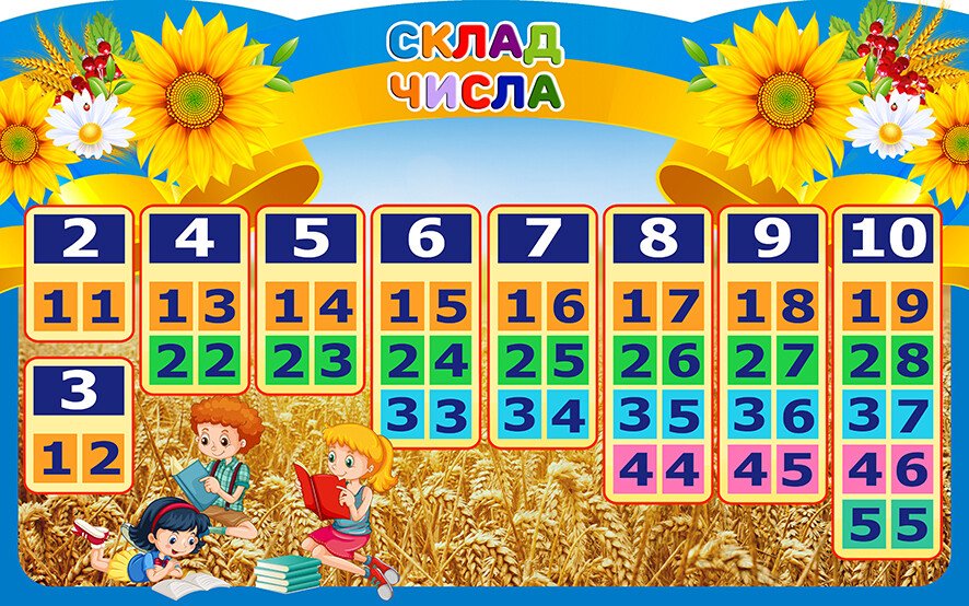 Стенд «Склад числа» призначений для освітньої діяльності в початкових класах. Він допомагає дітям вивчити різні комбінації чисел, які утворюють задані числа від 2 до 10.