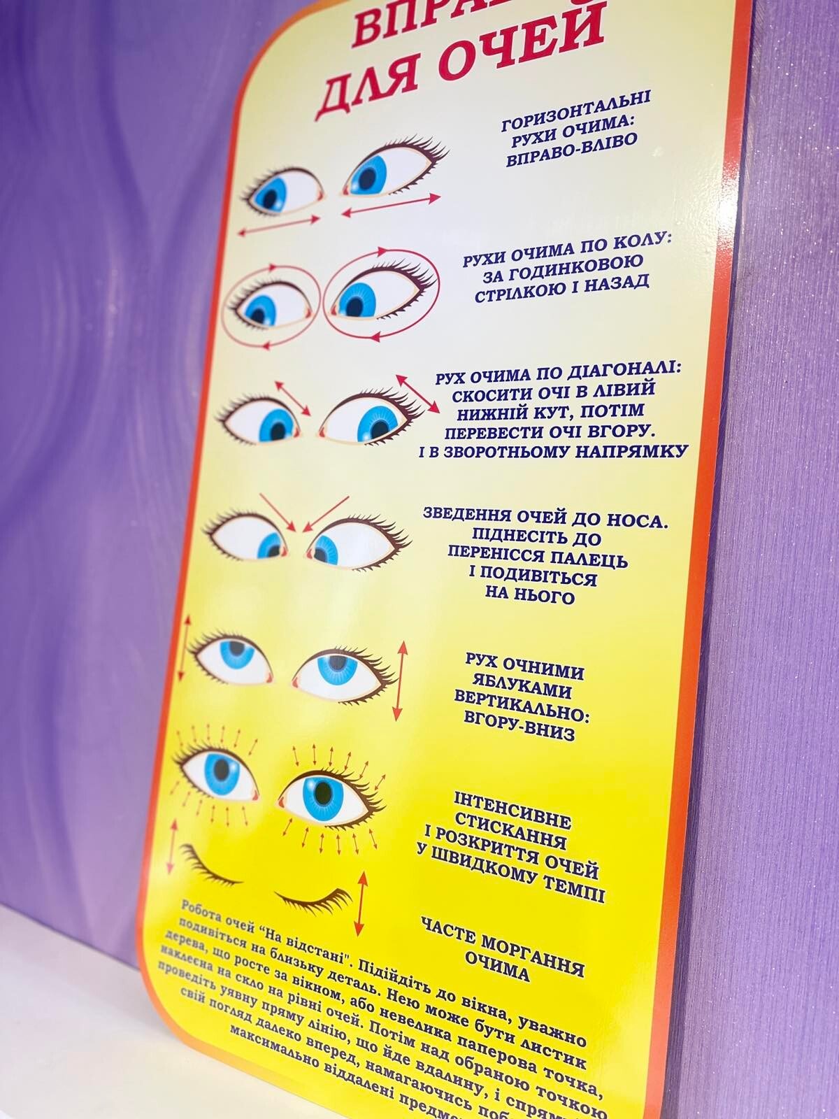 Стенд присвячений комплексам вправ для очей. Він містить інструкції з різноманітними рухами та техніками, які допоможуть зняти напругу та покращити стан зору.
