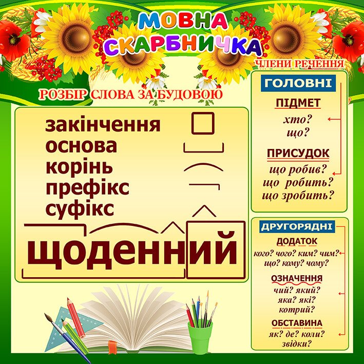 Стенд під назвою "Мовна скарбничка" призначений для допомоги вивчаючим українську мову у розборі слів за будовою та аналізу членів речення.