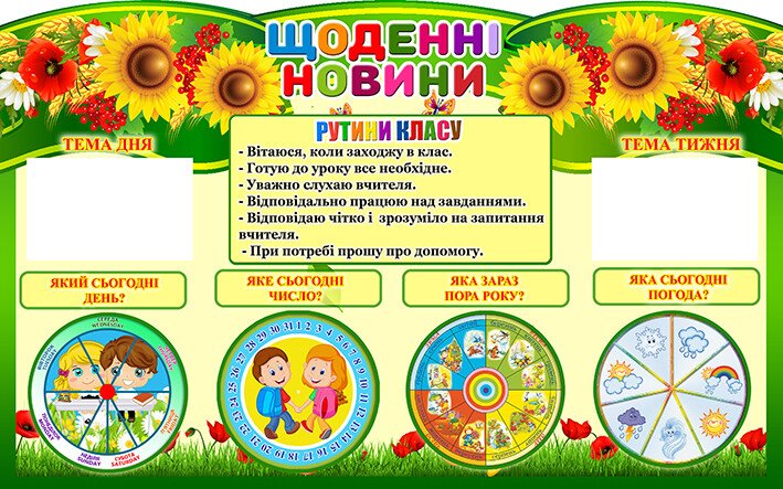 Цей стенд допомагає організувати навчальний процес, привертаючи увагу до щоденних звичок і навчальних тем.