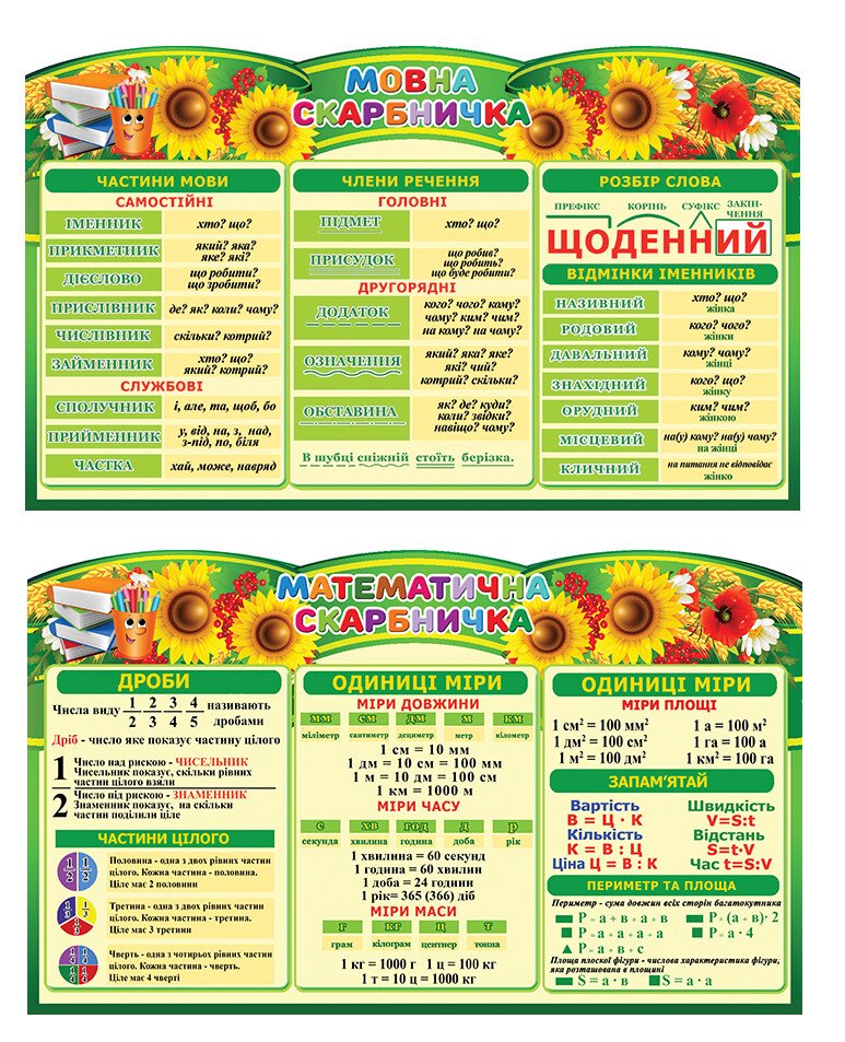 Назад Перейти в В порівняння Стенди “Скарбнички” (Артикул: 4-NK_563) Характеристики Розмір стенда: 60х100 см Матеріал стенда: пластик ПВХ товщиною 3 мм. Короткий опис стенда(ів) Комплект стендів «Скарбничка» призначений для учнів і допомагає вивчати українську мову та математику. Мовна скарбничка включає: Частини мови: самостійні та службові - іменник, прикметник, дієслово, прислівник, числівник, займенник, прийменник. Члени речення: головні - підмет і присудок; другорядні - додаток, означення, обставина. Розбір слова та відмінки іменників. Математична скарбничка містить: Дроби: поняття і частини цілого. Одиниці виміру: довжина, площа, об'єм, час, маса з таблицями співвідношень. Формули для обчислення вартості, швидкості, периметру та площі. Вартість: 1440 грн. ХОЧУ КУПИТИ Замовити допомогу дизайнера Кожен елемент комплекту можна придбати окремо. Додаткова інформація Термін виготовлення: 3-7 робочих днів. Можливість ламінування: Так. +100 грн/м2. Способи доставки: Транспортна компанія "Нова пошта" Способи оплати: Оплата при отриманні;Оплата на карту (передоплата);По перерахунку. Кріплення: В комплекті. Саморізи звичайні. Також вас можуть зацікавити Стенди ” Скарбнички” (Артикул: 4-NK-643) Вартість: 1380 ₴ Набір стендів “Мовна та математична скарбнички” (АРТИКУЛ: 4-NK-1001) Вартість: 1150 ₴ НАБІР СТЕНДІВ “МОВНА ТА МАТЕМАТИЧНА СКАРБНИЧКИ” (АРТИКУЛ: 4-NK-777) Вартість: 1104 ₴ НАБІР СТЕНДІВ “МОВНА ТА МАТЕМАТИЧНА СКАРБНИЧКИ” (АРТИКУЛ: 4-NK-1001) Вартість: 1104 ₴ Хіти продажу Комплект стендів ” Мовна та математична скриньки” (Артикул: 4-NK-650) Вартість: 1440 ₴ Вислови про Україну (Артикул: 4-NK_805) Вартість: 690 ₴ Стенди ” Скарбнички” (Артикул: 4-NK-643) Вартість: 1380 ₴ Математична та мовна скарбничка (Артикул: 4-NK-211) Вартість: 1104 ₴ Нещодавно переглянуті Стенди “Скарбнички” (Артикул: 4-NK_563) Вартість: 1440 ₴ Стенди “Куточок безпеки” (Артикул: 4-NK_5673) Вартість: 430 ₴ Комплект стендів “Екологічне виховання” (Артикул: 4-ЕV-0010) Вартість: 1630 ₴ Категорії стендів: ≡ Стенди для початкових класів ≡ Комплекти стендів для НУШ ≡ Комплекти стендів для початкової школи ≡ Математичні куточки для початкової школи ≡ Мовні куточки для початкової школи ≡ Стенди для початкової школи - Різні