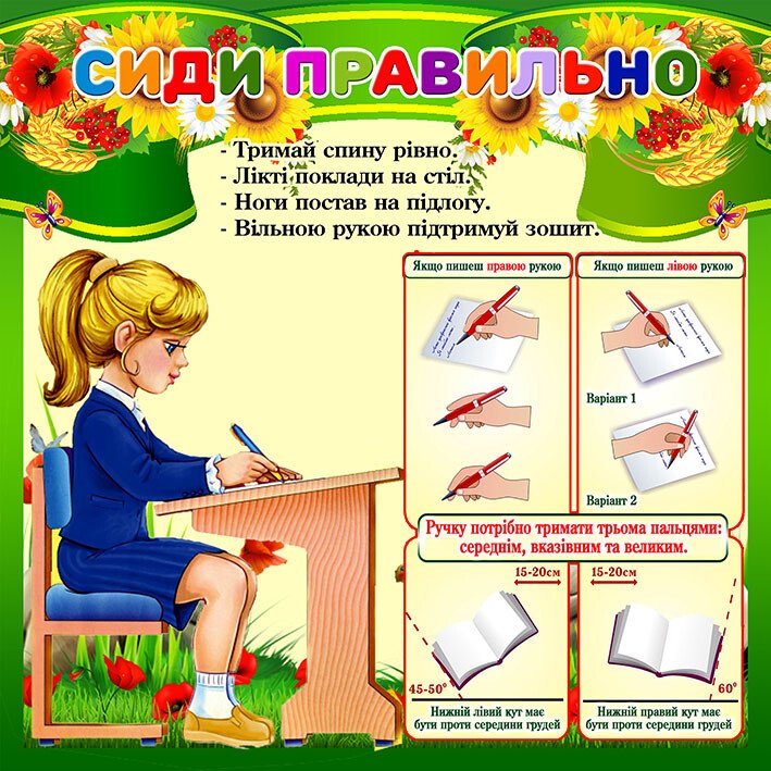 Стенд "Сиди правильно" призначений для навчання школярів правильної постави під час письма. Він містить ключові рекомендації: